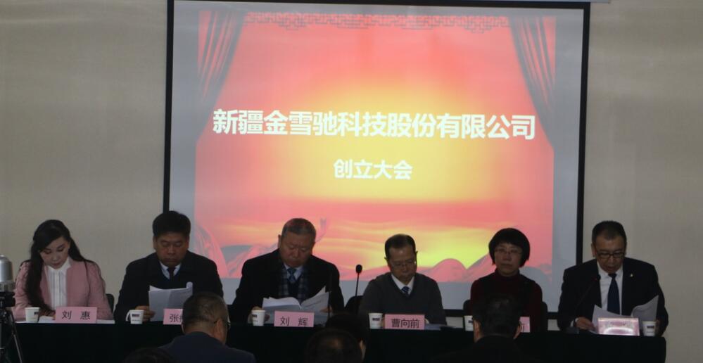 2016年12月6日上午,新疆金雪馳科技股份有限公司在烏魯木齊市經濟開發區舉行了創立大會,公司董事長劉輝與總經理曹向前共同為新疆金雪馳科技股份有限公司揭牌,喜慶的鞭炮聲振耳欲聾,預示著烏魯木齊市隆成實業完成了它的歷史使命,從此開啟了企業大發展的新征程。創立大會后,召開了股份公司第一屆董事會第一次會議。