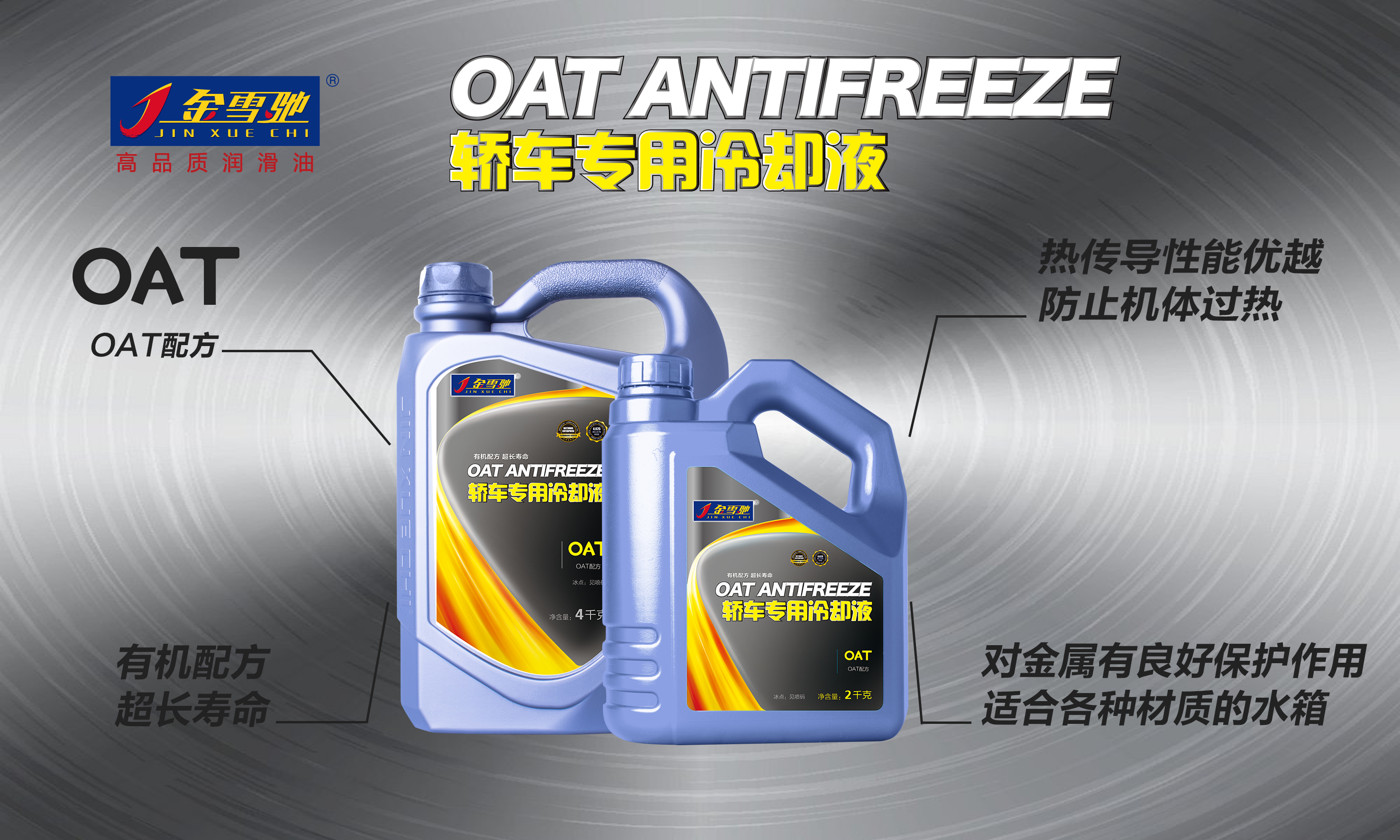 OAT Antifreeze 轎車專用冷卻液采用國際先進的OAT有機配方及離子膜鈍化技術,具有持久高效的抑制水垢、保護水箱腐蝕的作用,使用壽命更長,符合環保要求。