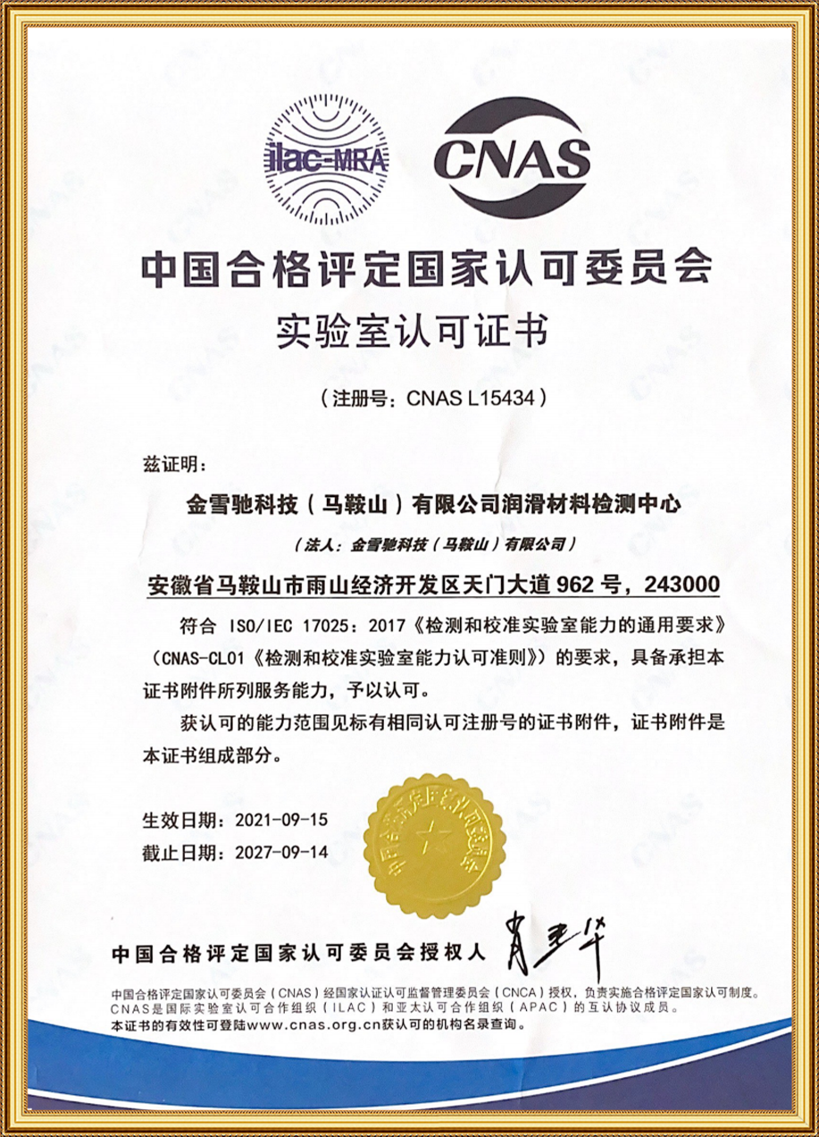 2021年金雪馳科技(馬鞍山)有限公司潤(rùn)滑材料檢測(cè)中心獲得國(guó)家認(rèn)可CNAS實(shí)驗(yàn)室資質(zhì)證書。