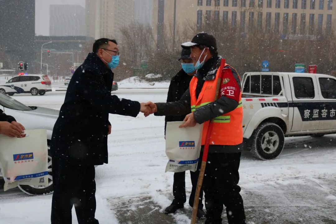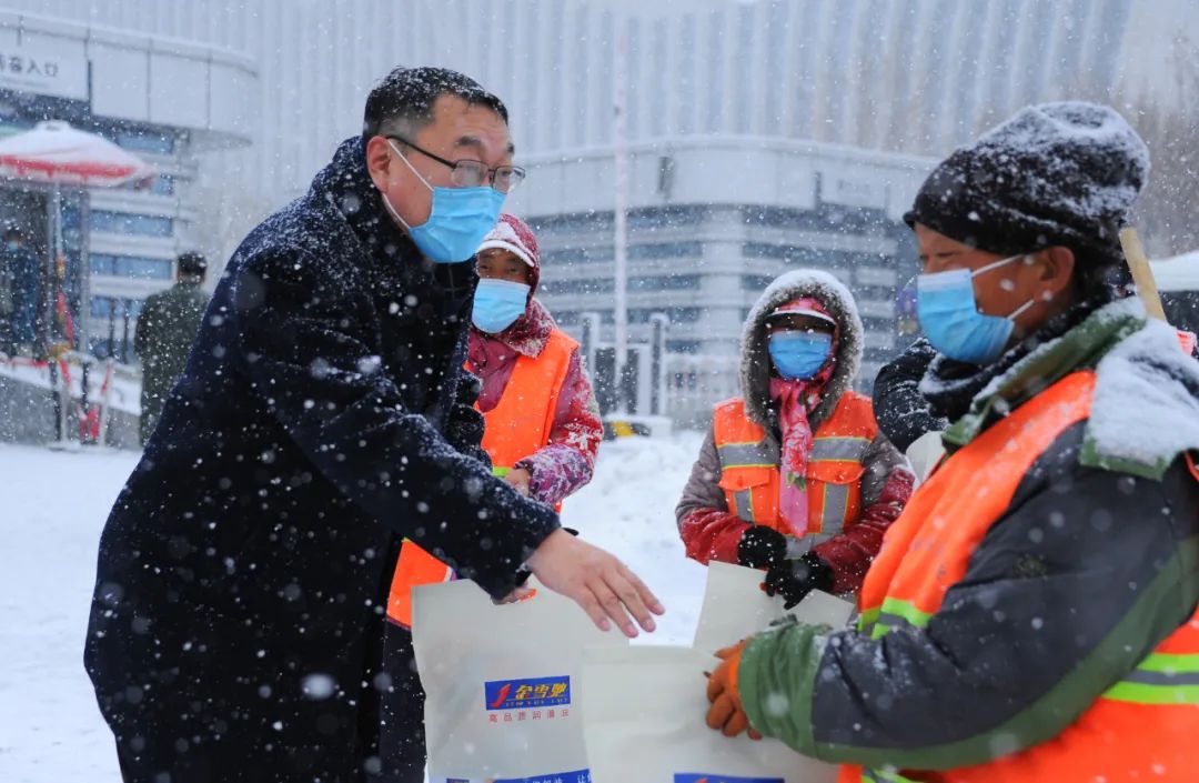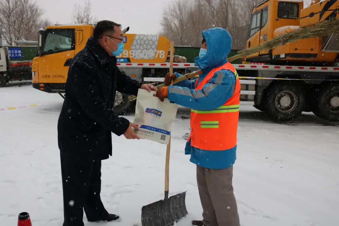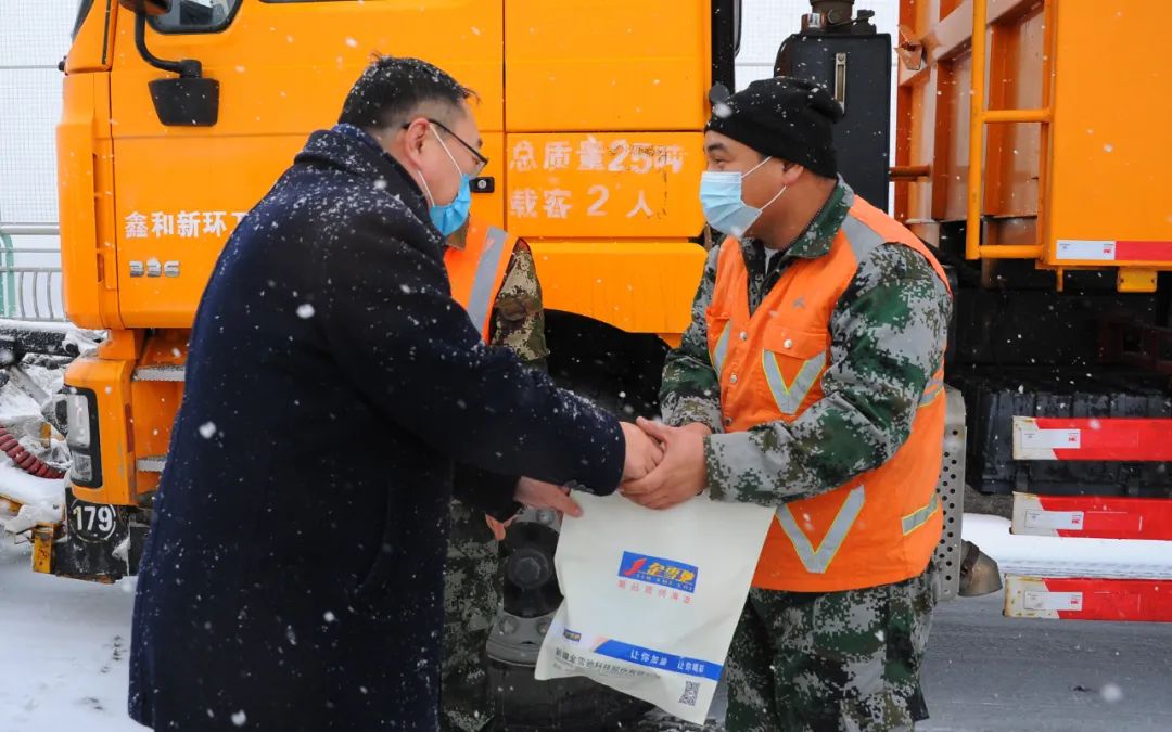 為表達(dá)對(duì)環(huán)衛(wèi)工人們的敬意,給他們送去一份溫暖和關(guān)愛,2021年12月9日,新疆金雪馳科技股份有限公司組織開展為環(huán)衛(wèi)工人送溫暖活動(dòng)。新疆金雪馳科技股份有限公司副總經(jīng)理庫國(guó)強(qiáng)先生代表公司慰問在大雪中辛苦工作的環(huán)衛(wèi)工人,并送上精心準(zhǔn)備的勞保用品,讓環(huán)衛(wèi)工人們感受到冬日的“溫暖”。