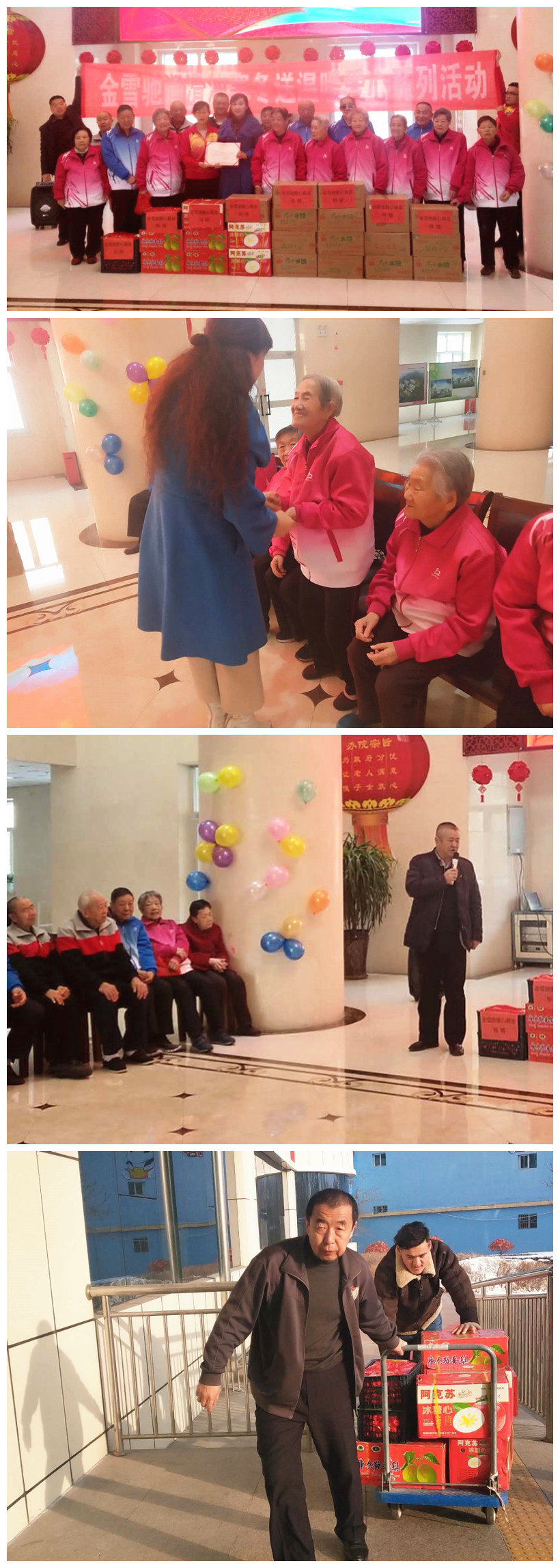 2月11日,金雪馳愛心小組帶著滿滿的禮物和暖暖的愛心來到了烏魯木齊市養老院。一進入養老院,就看到老人們已經在大廳等候,有些依然是熟悉的面孔。養老院的楊院長對金雪馳愛心小組的到來表示由衷的感謝,并對老人們說:“金雪馳愛心小組每年都會來看你們,給你們送來水餃、水果和節日的祝福,這種愛心已經持續20年了”。看到老人們興致高昂的笑臉,金雪馳愛心小組隨即為老人們獻上了即興表演——一段鏗鏘有力的秦腔。金雪馳的愛心不在于物質有多少,貴在堅持!臨別之際,老人們依依不舍地抓著小組成員的手說道:“非常感謝你們對我們這么多年的關心和照顧?!睈坌男〗M成員劉惠與老人們一一握別,她深情地對老人們說:”我們明年還會再來看你們的,你們都要好好保重身體,天天開心!”