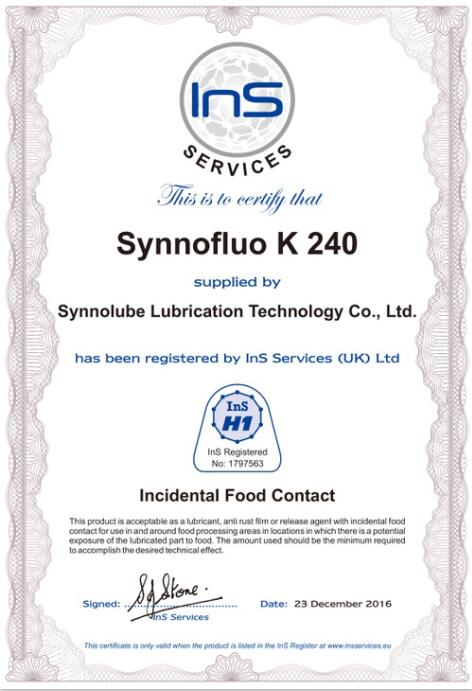 近日,金雪馳科技股份有限公司旗下的Synnofluo K 500、Synnofluo K 240兩項潤滑脂產品順利通過歐洲Ins的H1食品級認證。食品級潤滑產品是指 對人體無害的潤滑產品;可使用于食品、藥物等生產的制造設備上。食品級潤滑劑的形態包含液態的潤滑油、潤滑脂、潤滑膏等。
