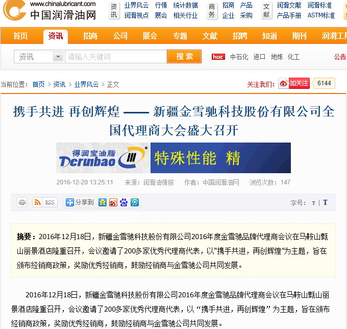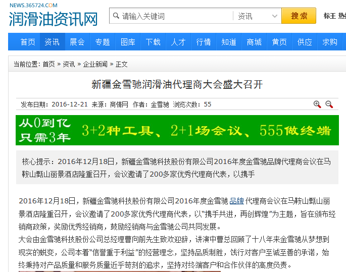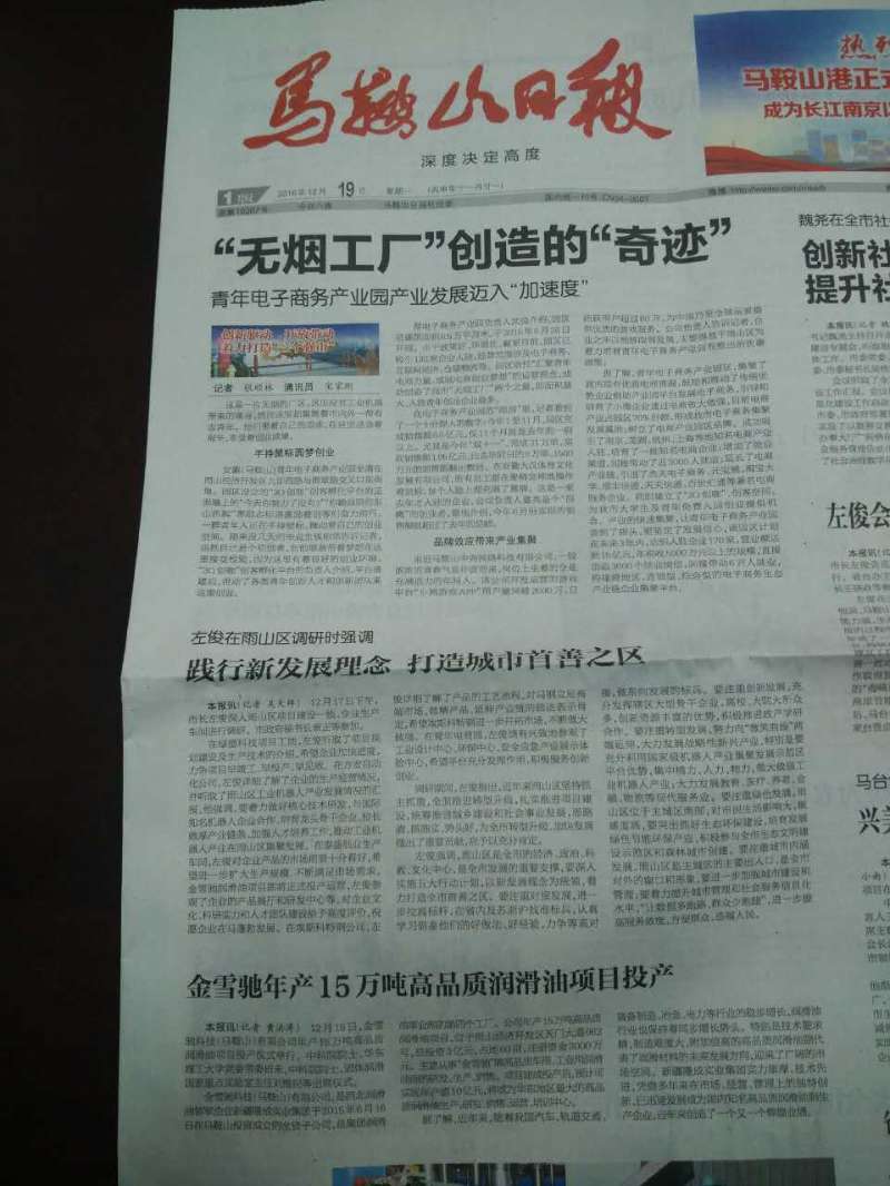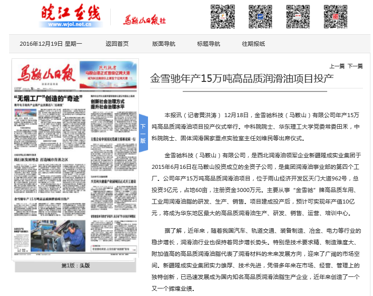 隨著金雪馳科技(馬鞍山)有限公司15萬噸高品質潤滑產品項目的正式投產和2017年代理商大會的完美落幕,金雪馳品牌成為最近媒體關注的焦點。安徽日報、馬鞍山日報、中國化工報、安徽廣播電臺、馬鞍山電視臺、中國潤滑油網、中國潤滑油資訊網、中國潤滑油情報網等新聞媒體第一時間進行了宣傳報道。