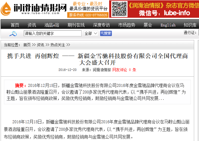 新疆金雪馳科技股份有限公司董事長劉輝先生在大會發言中所說“隨著馬鞍上新廠順利建成投產,將為金雪馳的發展插上一雙騰飛的翅膀。未來三年,金雪馳科技股份公司將完成潤滑油產業在全國的生產制造布局;我們還要加大科技投入,進軍高端潤滑油品研發和市場開拓; 爭取在二零一九年,新疆金雪馳股份公司在主板上市”。劉總的致辭為企業繪制了宏偉的藍圖、指明了企業發展方向,同時也更加堅定了合作伙伴的信心。面對嶄新的2017年,讓我們緊密合作、開拓創新,用我們的汗水和智慧創造金雪馳經濟奇跡。
