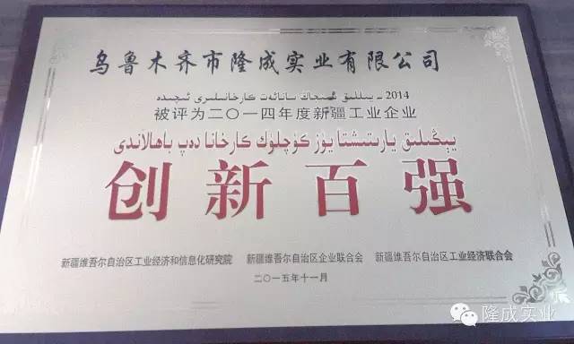 2015年12月4,自治區經信委召開新疆工業企業創新百強發布會,烏魯木齊市隆成實業有限公司榮膺“新疆工業企業創新百強”稱號。