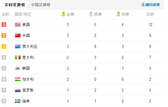 截止目前,中國已經獲得了3枚金牌,2枚銀牌,3枚銅牌,共計8枚獎牌。