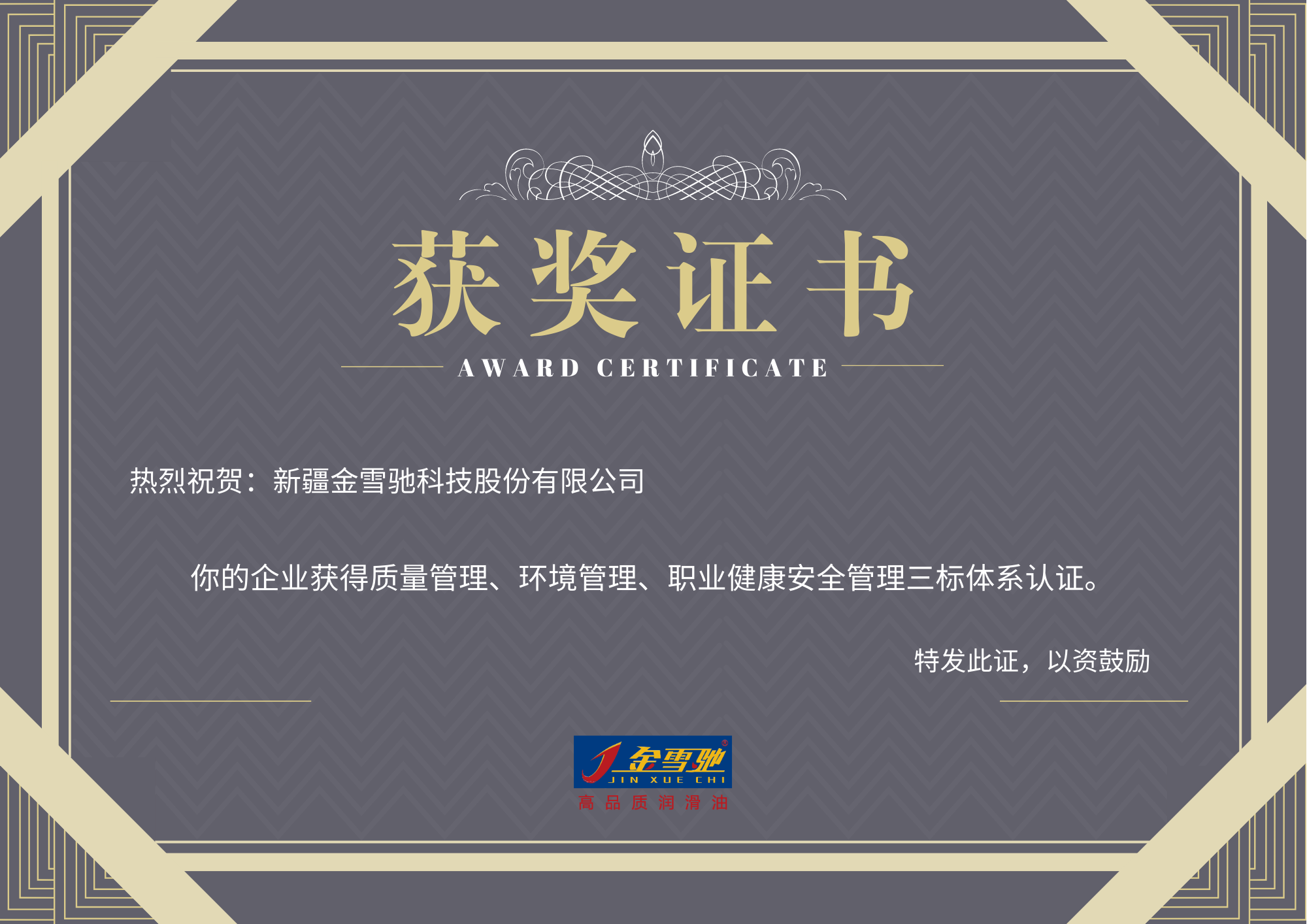 再獲認證!金雪馳科技榮獲三標管理體系認證證書